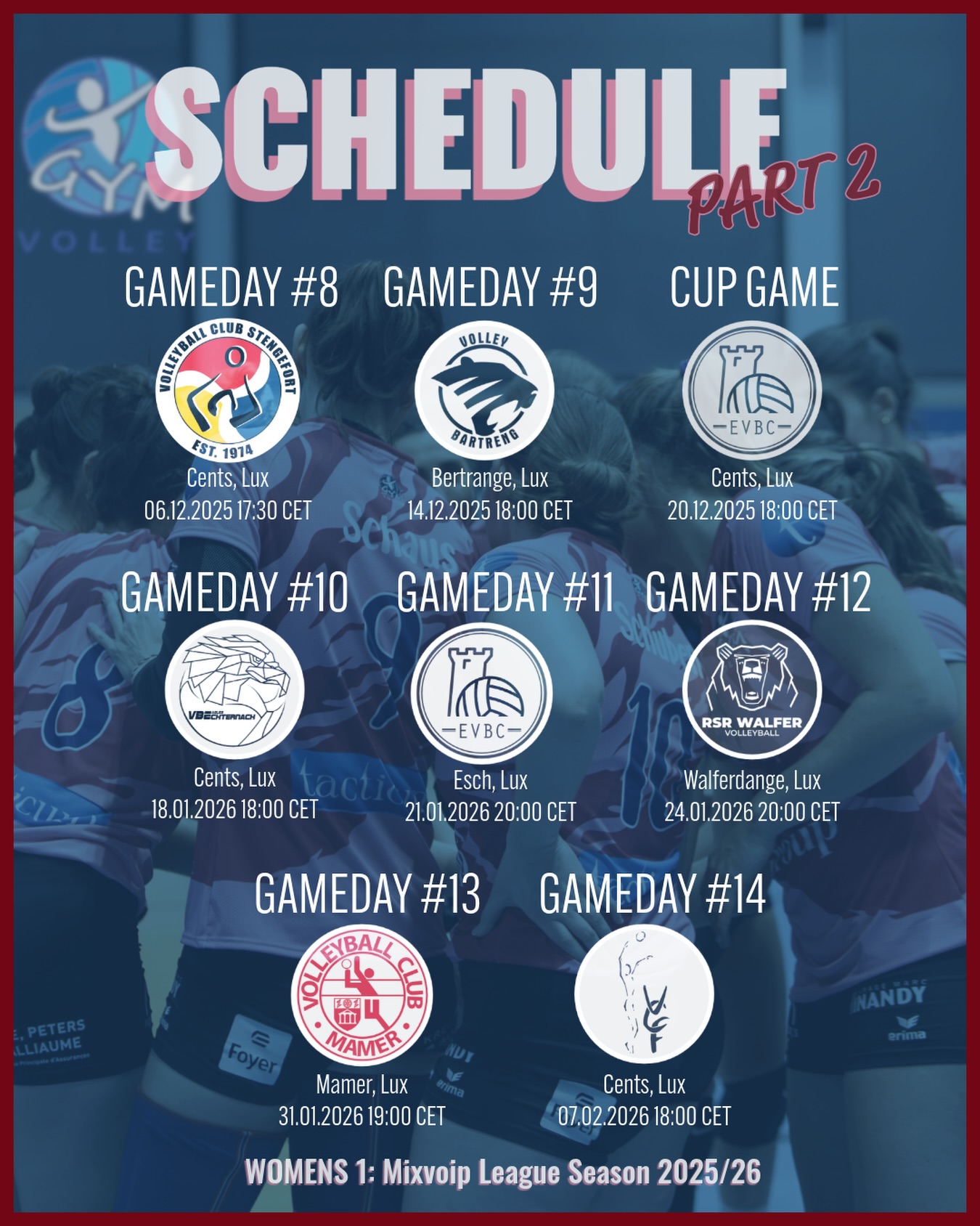 | 18.01.26 | 18:00 | MVL F | CS GYM Volley 1 | VB Echternach 1 | Hall Omnisports Cents (Terrain Central) |