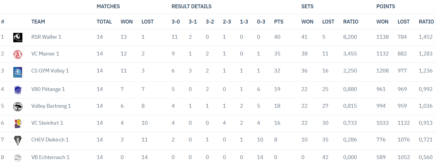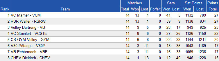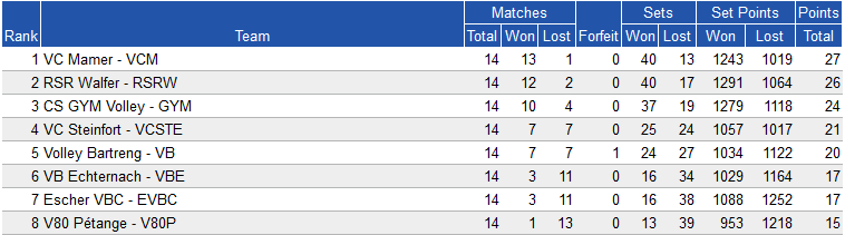 VCM Dames 1 | 14 | 12 | 2 | 35 |